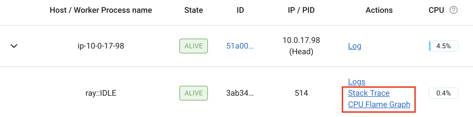 Ray dashboard 可让您通过单击活动工作进程、任务、参与者和作业驱动进程的“CPU 分析”或“堆栈跟踪”操作来分析 Ray 驱动程序或工作进程。