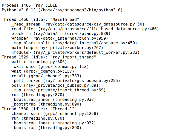 安装完 py-spy 后(当 安装 Ray 的 “Ray Dashboard” 组件之后,也会自动的安装进来),你可以执行 ray stack 转储当前节点上所有 Ray Worker 进程的堆栈跟踪。