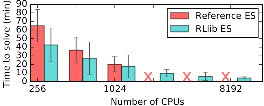 RLlib’s ES implementation scales further and is faster than a reference Redis implementation on solving the Humanoid-v1 task.#