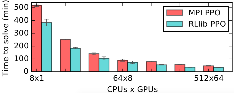 pytorch tensorflow [paper] [implementation] PPO’s clipped objective supports multiple SGD passes over the same batch of experiences. RLlib’s multi-GPU optimizer pins that data in GPU memory to avoid unnecessary transfers from host memory, substantially improving performance over a naive implementation. PPO scales out using multiple workers for experience collection, and also to multiple GPUs for SGD.