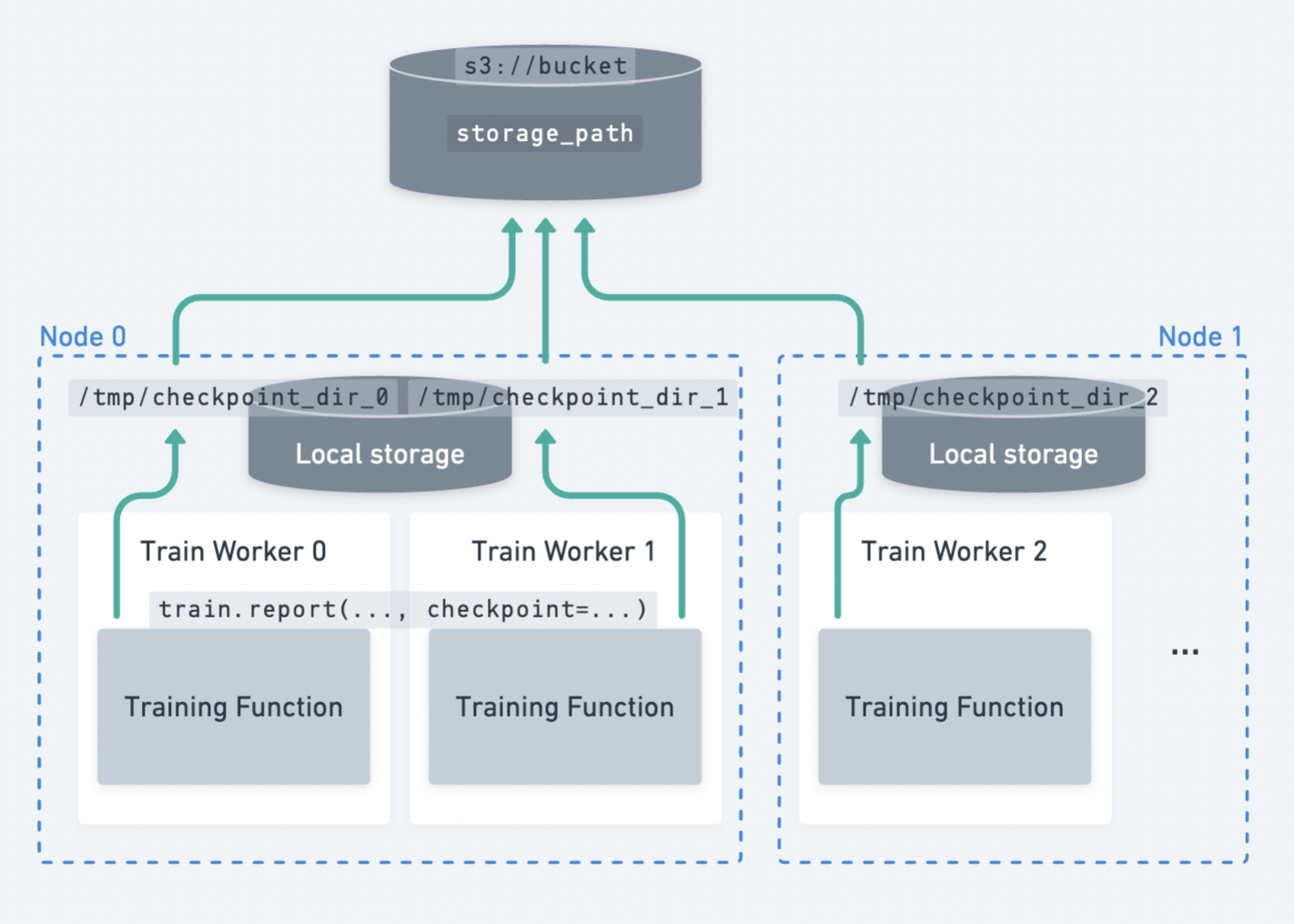 An example of multiple workers spread across multiple nodes uploading checkpoints to persistent storage.#